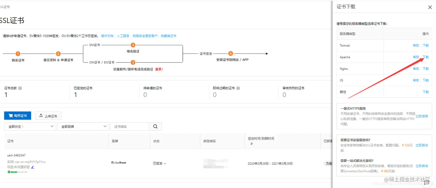 其他:如果是自己的证书就省略了生成这一步,下面以阿里云ssl为例