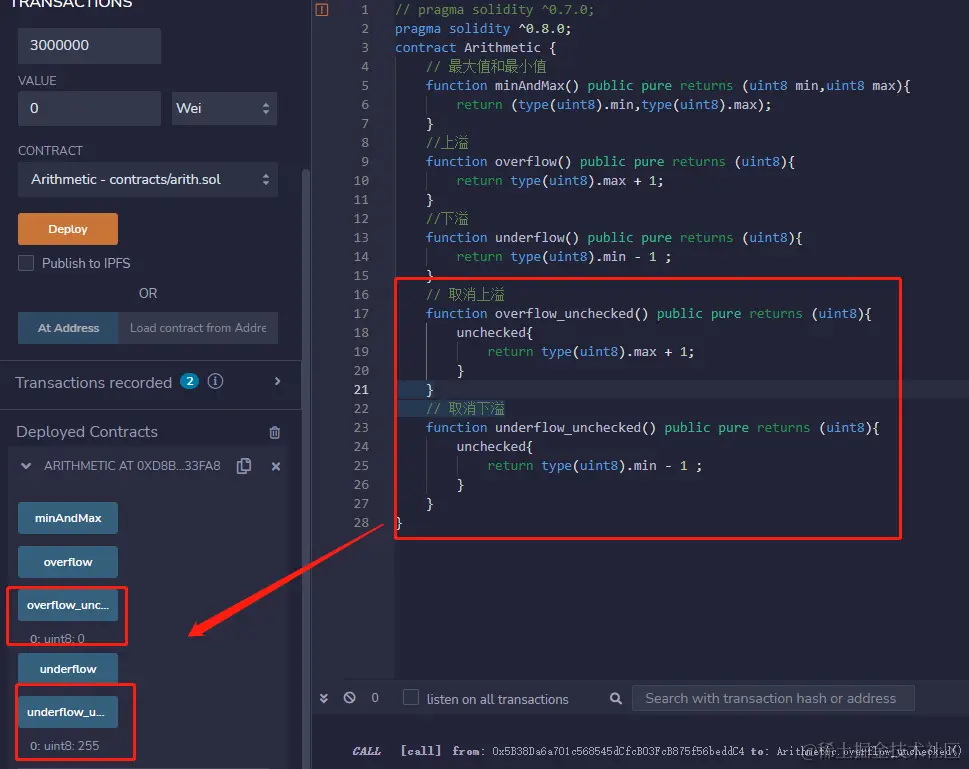 overflow,执行代码type(uint8).max + 1时没有报错,而是返回了计算结果0。 - 调用下溢方法