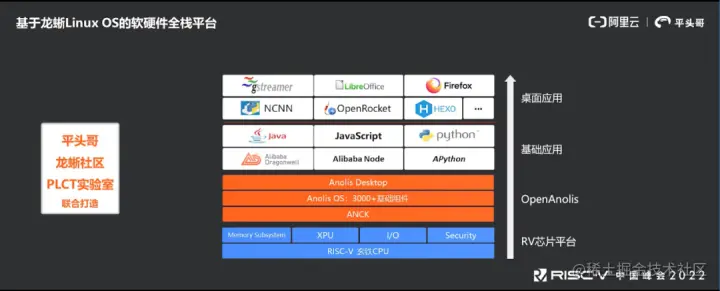8 月 24 日,上海科技大学和中国科学院软件研究所联合主办的 RISC-V 中国峰会上,本届 RISC-V 中国峰会主席、平头哥半导体副总裁孟建熠展示由龙蜥社区、平头哥、中科院软件所 PLCT 实验室联合打造的 RISC-V 芯片、OS 和生态应用的软硬件全栈平台,完成了龙蜥操作系统的 3000 多个基础包适配,帮助 RISC-V 架构从嵌入式应用拓展到桌面和云上应用。