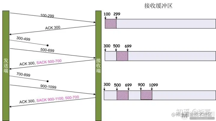另外一种更好的方式叫:Selective Acknowledgment (SACK)(参看RFC 2018),这种方式需要在TCP头里加一个SACK的东西,ACK还是Fast Retransmit的ACK,SACK则是汇报收到的数据碎版。参看下图: