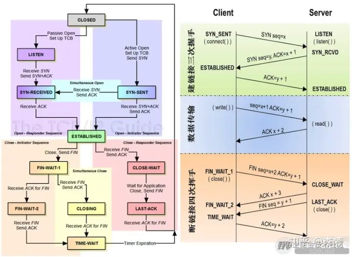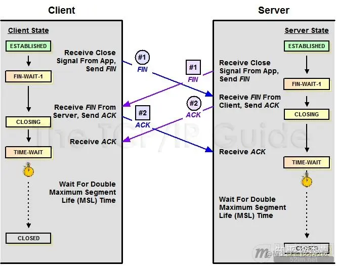· 对于4次挥手:其实你仔细看是2次,因为TCP是全双工的,所以,发送方和接收方都需要Fin和Ack。只不过,有一方是被动的,所以看上去就成了所谓的4次挥手。如果两边同时断连接,那就会就进入到CLOSING状态,然后到达TIME_WAIT状态。