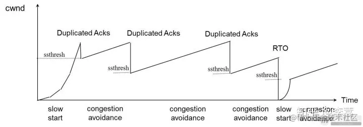 前面说过,还有一个ssthresh(slow start threshold),是一个上限,当cwnd >= ssthresh时,就会进入“拥塞避免算法”。一般来说ssthresh的值是65535,单位是字节,当cwnd达到这个值时后,算法如下: