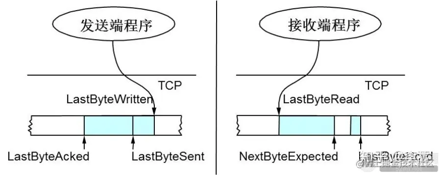 · 发送端的LastByteAcked指向了被接收端Ack过的位置(表示成功发送确认),LastByteSent表示发出去了,但还没有收到成功确认的Ack,LastByteWritten指向的是上层应用正在写的地方。