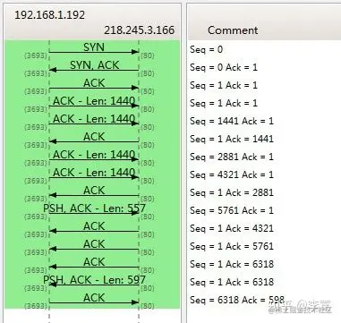 下图是我从Wireshark中截了个我在访问coolshell.cn时的有数据传输的图给你看一下,SeqNum是怎么变的。(使用Wireshark菜单中的Statistics ->Flow Graph… )