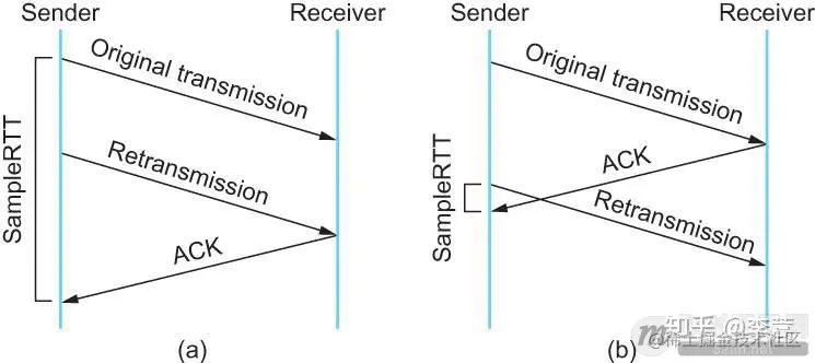 · 情况(b)是ack回来慢了,但是导致了重传,但刚重传不一会儿,之前ACK就回来了。如果你是算重传的时间和ACK回来的时间的差,就会算短了。