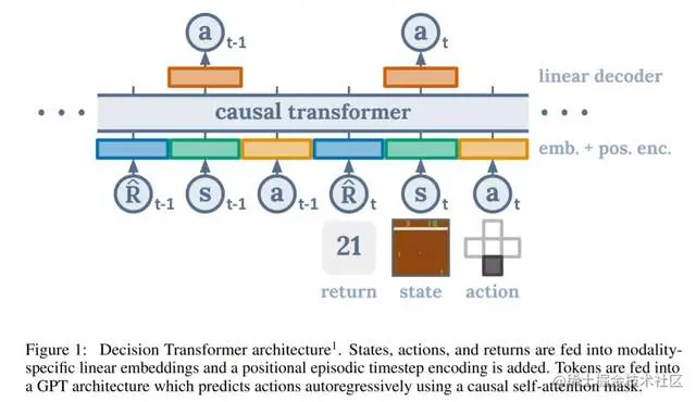 基于这一观察结果,我们提出了Decision Transformer,其中我们使用GPT架构来自回归模型轨迹(如图1所示)。我们研究序列建模是否可以通过在Atari[10]、OpenAI Gym[11]、RL离线基准上评估Decision Transformer来执行策略优化。Key-to-Door[12]环境。我们证明,在不使用动态规划的情况下,Decision Transformer匹配或超过了最新RL算法的性能[13,14]。此外,在需要长期信用分配的任务中,Decision Transformer能够出色地优于RL基线。通过这项工作,我们的目标是将序列建模和转换器与RL连接起来,并希望序列建模能够成为RL的一个强大的算法范式。