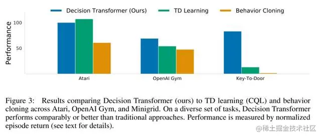 在本节中,我们研究了Decision Transformer相对于专用离线RL和模仿学习算法的性能。特别是,我们的主要比较点是基于TD-learning的无模型脱机RL算法,因为我们的Decision Transformer架构本质上也是无模型的。此外,TD-learning是RL中用于提高样本效率的主要范式,也是许多基于模型的RL算法的一个子例程[16,17]。我们还比较了行为克隆和变异,因为它也涉及到类似于我们的基于可能性的策略学习制定。具体的算法取决于环境,但我们的动机如下: