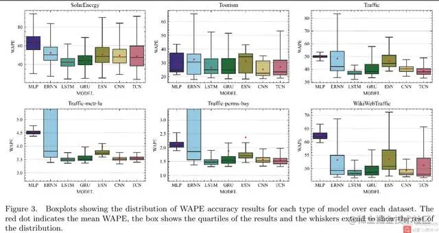 图3。显示每种类型的模型在每个数据集上的WAPE精度结果分布的箱形图。红点表示平均WAPE,方框表示结果的四分位数,线段延伸表示其余的分布。