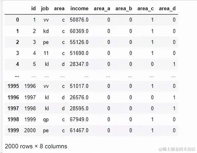 display(df[['id','job','area','income','area_a', 'area_b','area_c','area_d']])