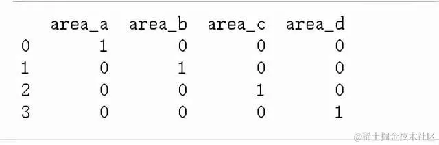 dummies = pd.get_dummies(['a','b','c','d'],prefix='area')