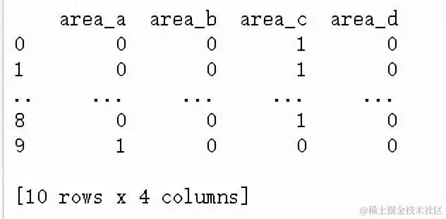 要对“area”列进行编码,我们使用以下方法。注意,有必要将这些假人合并回数据帧中。