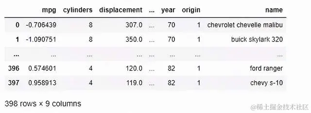 下面的Python代码用z-score替换mpg。汽车的平均MPG将接近于零,高于零是高于平均,低于零是低于平均。z分数高于/低于-3/3的情况非常罕见,这些都是异常值。