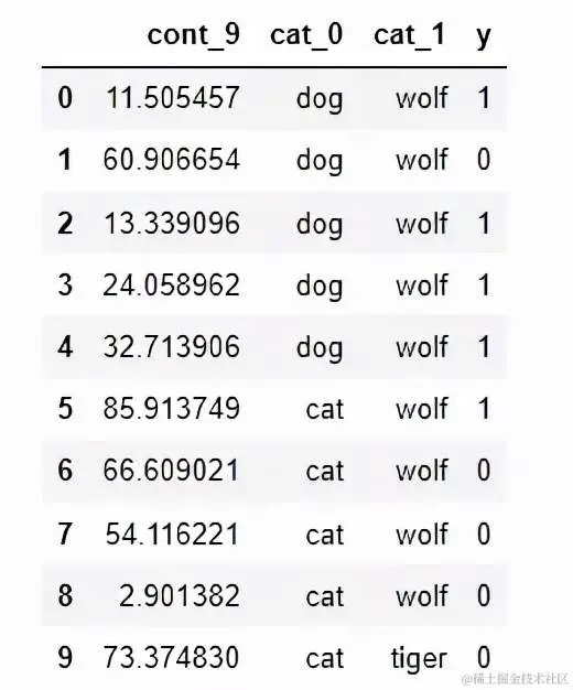 'cat_1': ['wolf'] * 9 + ['tiger'] * 1,