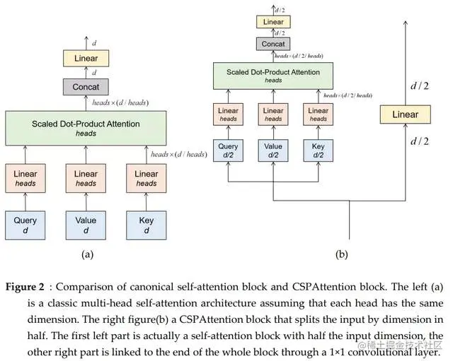 而假设CSPAttention将输入维度分成两半,则CSPAttention的第一部分只有一个线性投影层,而第二部分有四个线性投影层。 相应的体系结构如图2(b) 所示。