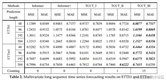 (5)在单变量设置下,Informer+优于TCCT_1和TCCT_2,证明了添加编码器的方法是有效的。在目前的实验环境下,它甚至有25%的机会超过TCCT_3。然而,在多变量条件下,Informer+完全被TCCT_3打败,随着预测长度的增加,开始输给TCCT_2。