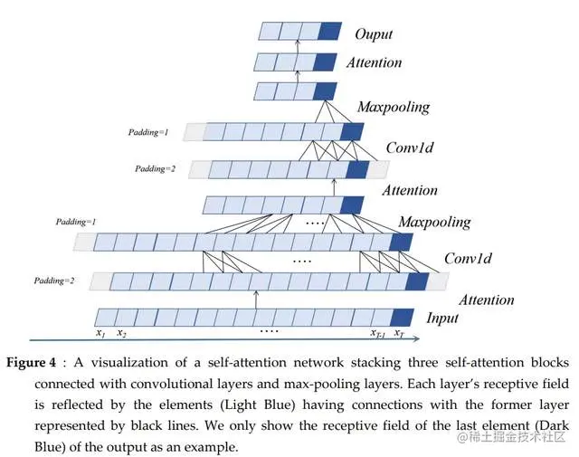 图5:一个自我注意网络的可视化,它将三个自我注意块堆叠在一起,这些块与扩大的因果卷积层和最大池层相连接。整个体系结构类似于图4。然而,扩展的因果卷积层的应用拓宽了接受域,避免了未来的信息遗漏。