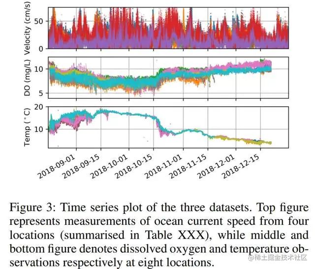 图3:三个数据集的时间序列图。上图为四个地点的海流速度测量值(见表XXX),而中图和底图分别为八个地点的溶解氧和温度观测值。