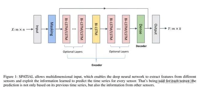 图1:SPATIAL允许多维输入,这使得深度神经网络能够从不同的传感器中提取特征,并利用学习到的信息预测每个传感器的时间序列。也就是说,对于每个传感器来说,预测不仅基于它之前的时间序列,还基于来自其他传感器的信息。