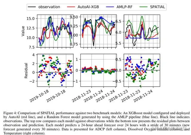 图4:SPATIAL性能对比两个基准模型:一个是由AutoAI配置和部署的XGBoost模型(红线),另一个是使用AMLP管道生成的Random Forest模型(蓝线)。黑线表示观察结果。上面一行比较每个模型与观测值,而下面一行则是观测值和预测值之间的残差图。每个模型预测24小时的提前预报,跨越30分钟(每30分钟产生一次新的预报)。数据为ADCP(左列),溶解氧(中列)和温度(右列)。