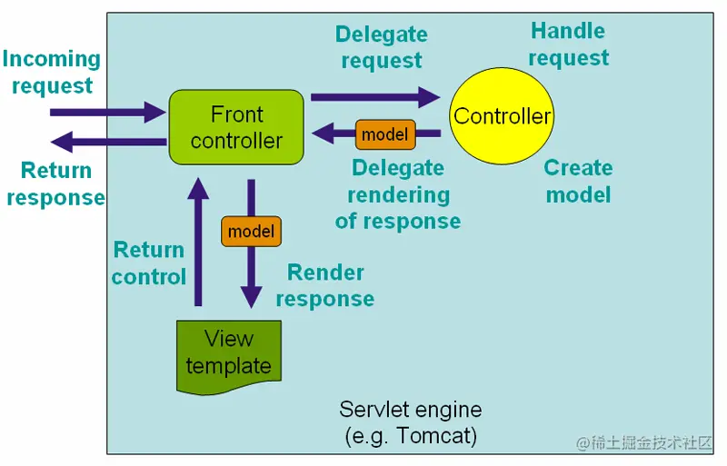 在 Spring MVC 应用程序中,RequestDispatcher (在 Front Controller 之下) 这个 servlet 负责将进入的 HTTP 请求路由到控制器的处理方法。