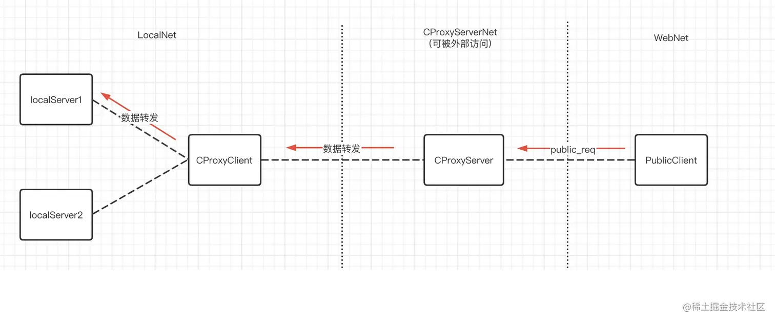 原理说起来也简单,CProxy本身有一个公网ip,LocalServer注册到CProxy上,PublicClient访问CProxy的公网ip和端口,之后CProxy再将数据转发到LocalServer,下图是整体访问的数据流