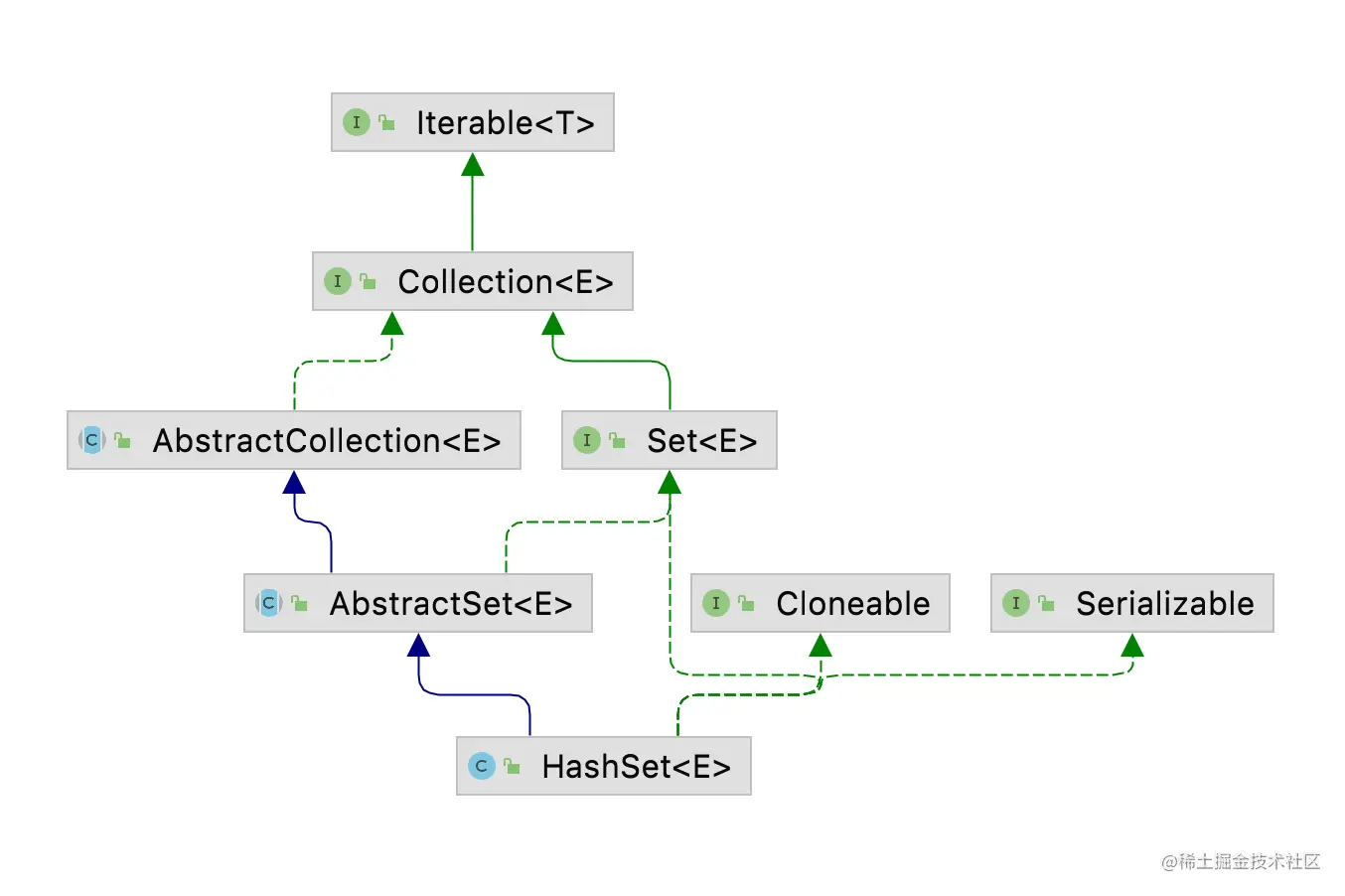- 直接继承了AbstractSet类,该类实现了Set的骨干操作