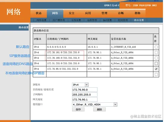 配置静态路由:配置默认路由从互联网接口出去,配置SIP服务器和语音网络从语音接口出去,这样本地既能上网又能打电话。