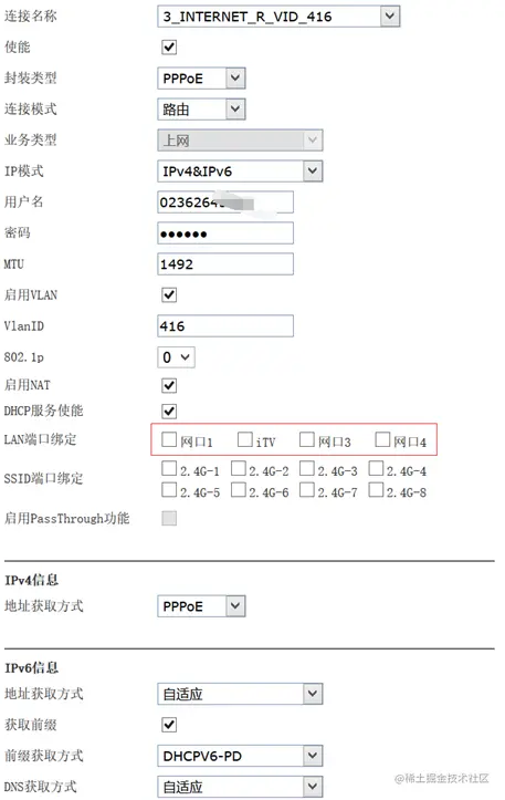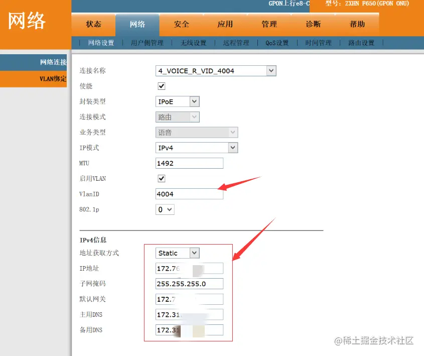 ,新建一个连接填入前面记录的IP信息、vlan,具体参考下图,业务类型其他,不绑定LAN端口,如果绑定LAN端口,会导致静态路由失效。