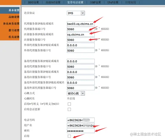 记录代理服务器、注册服务器的域名和端口号,向运营商获取语音的用户名密码,这些信息后续填入SIP软件中。关闭光猫的电话服务,取消该页面的启用,然后保存。