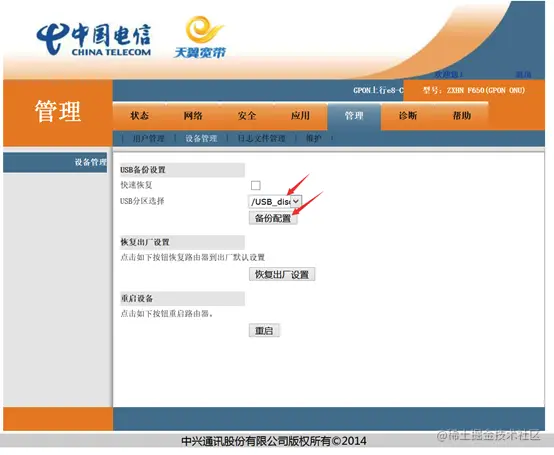 1、 备份:光猫插入USB,下图所示的界面选择备份配置,光猫的配置文件备份在e8_Config_Backup目录,如果操作过程中出现失误,选择快速恢复,重启恢复到备份状态。