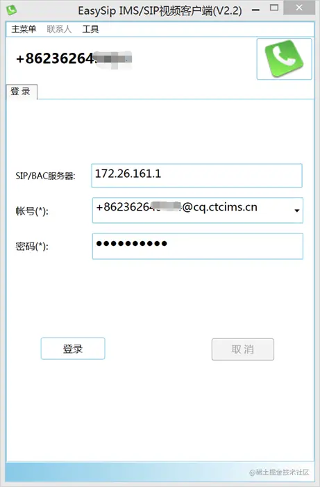 客户端使用EasySip,输入前面获取SIP代理服务器地址,我这里是172.26.161.1,如果输入SIP代理服务器域名需要在本地hosts文件中添加域名解析,因为公共DNS无法解析该域名。输入账号密码,登录。