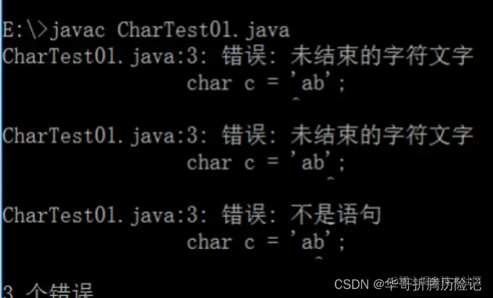 我们可以看出,编译器报错了,错误信息是“未结束的字符文字”,这是因为 Java 中有规定,字符型只能是单个字符,
