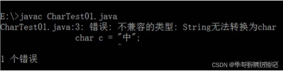我们可以看到 Java 中的 char 类型确实可以储存一个汉字。我们再来看以下程序,假设字符我们采用双引号括起来会怎么样: