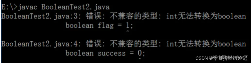 通过以上的测试结果可以看出,在 Java 中布尔类型的变量值不能使用 1 和 0,只能使用 true和 false。