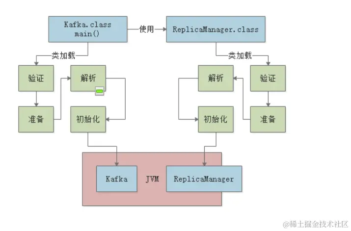 接着遇到你使用了别的类,比如“ReplicaManager”,此时就会从对应的“.class”字节码文件加载对应的类到内存里来。