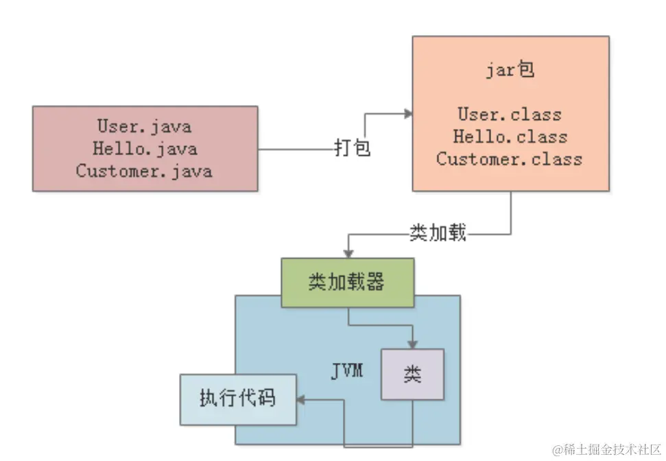在平时的开发过程中,我们编写的是java文件,会通过编译生成class文件,这些文件会打成一个jar包或者war包。可以在tomcat中,或者直接通过java命令启动,这个启动就是启动一个JVM进程。JVM进程在运行过程中,要通过类加载器,将class文件加载到JVM中,这样才可以执行jar包中的类文件。