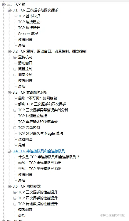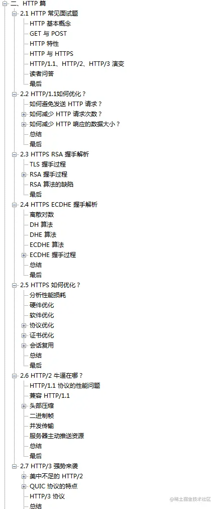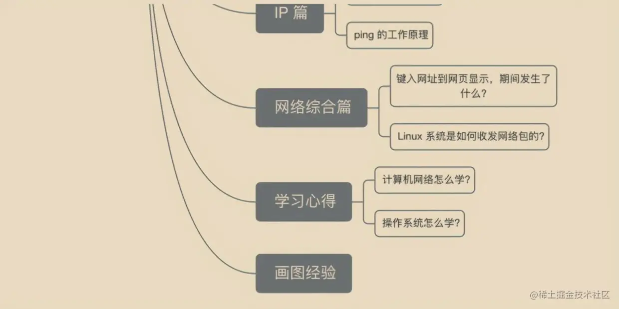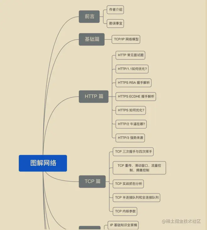共七大篇章:基础篇、HTTP篇、TCP篇、IP篇、网络综合篇、学习心得、画图经验