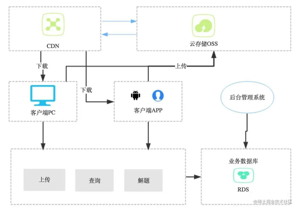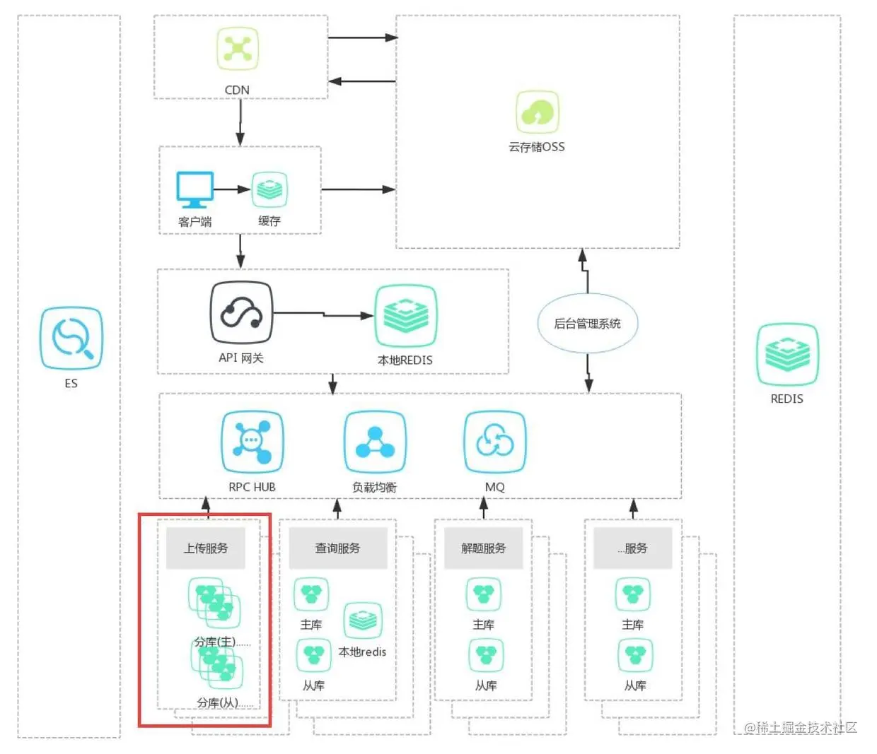 如上图所示,这种模式较单库单应用模式多了一个CDN、一个云存储OSS(七牛、又拍等雷同)。一个典型的应用流程(以用户上传、查看图片需求为例)如下: