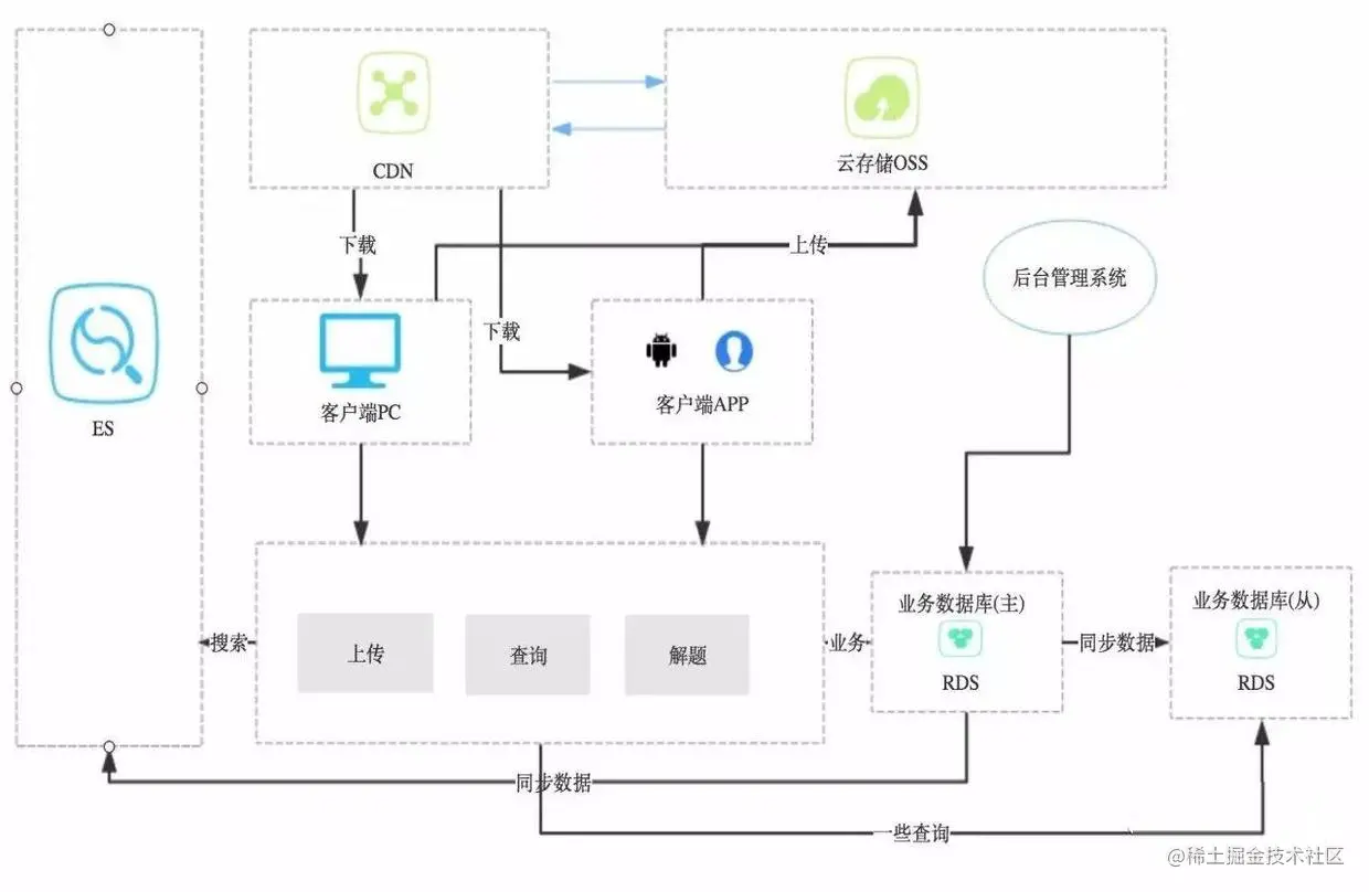 如上图所示,这种模式较单库单应用模式与内容分发模式多了几个部分,一个是业务数据库的主从分离,一个是引入了ES,为什么要这样?都解决了哪些痛点,下面具体结合业务需求场景进行叙述。