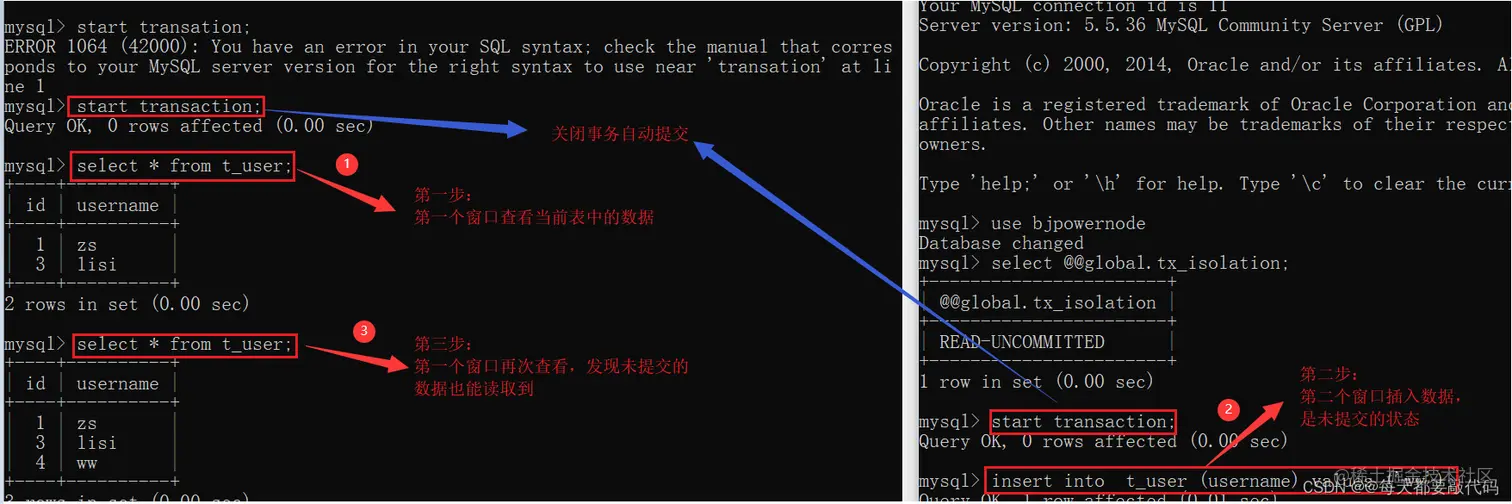 读未提交存在脏读(Dirty Read)现象:表示读到了脏的数据。