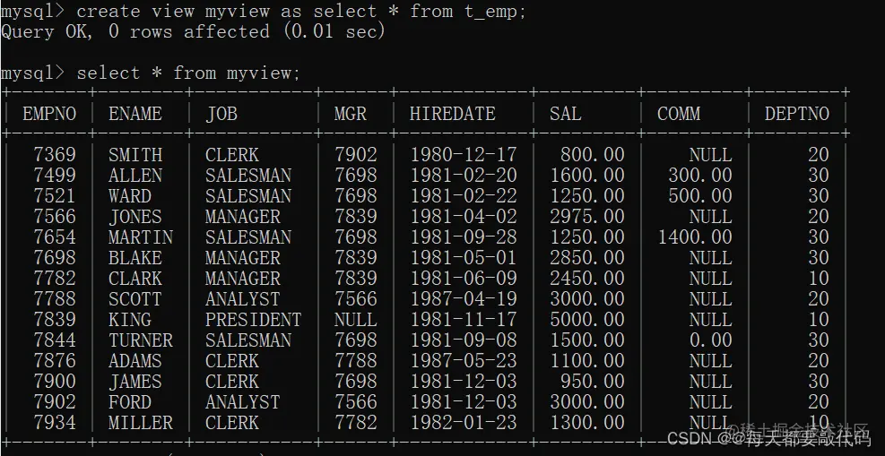 通过操作视图,可以操作原数据,删除视图myview里的7369那一行数据,我们发现原表t_emp的7369数据也被删除了