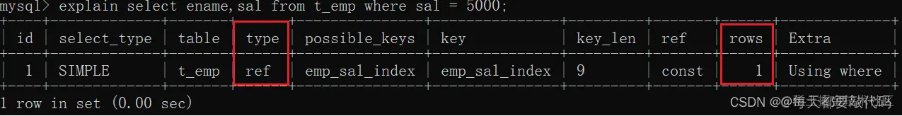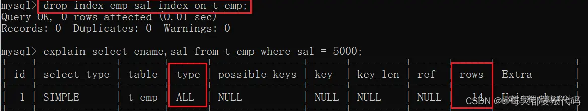 (3)删除索引,并再次查看drop index emp_sal_index on t_emp; explain select ename,sal from t_emp where sal = 5000;