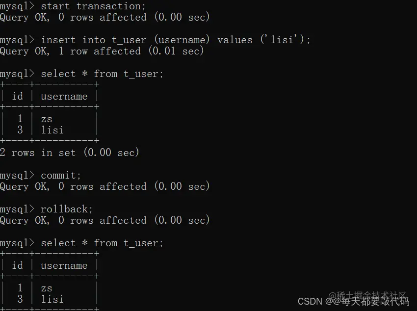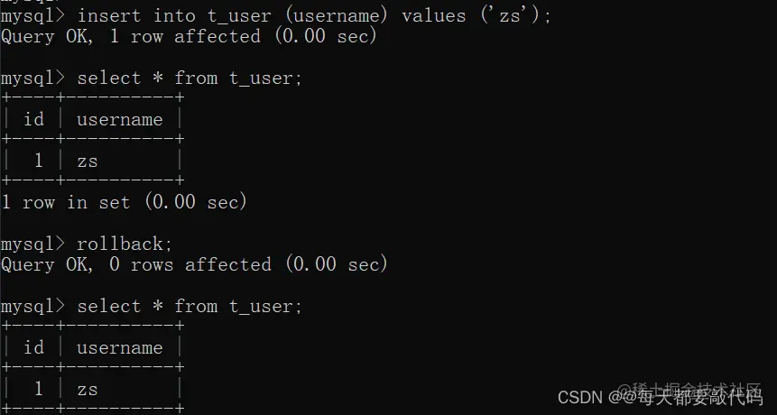select * from t_user; -- 回滚到插入上面这条数据之前的状态