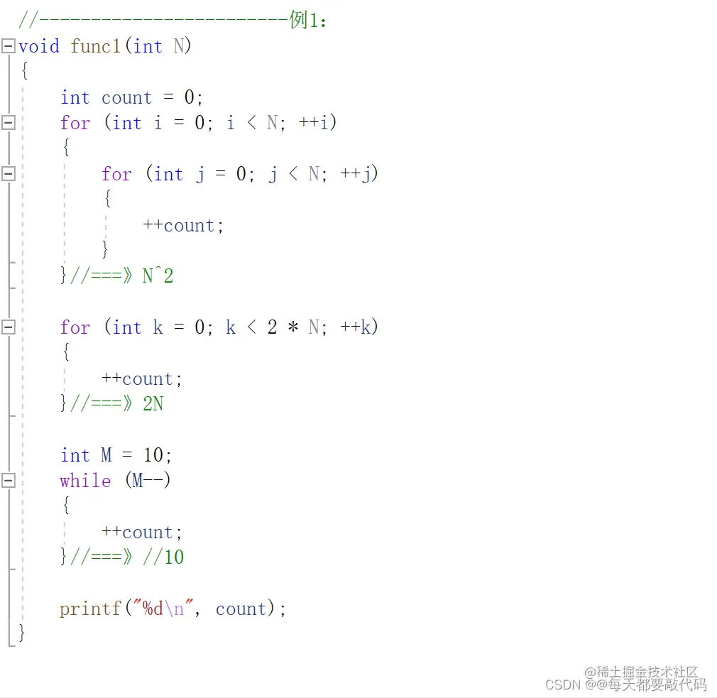 解析: 我们要求func1函数的时间复杂度,首先我们要分析代码的组成成分;第一部分是两个for循环,时间复杂度也就是O(