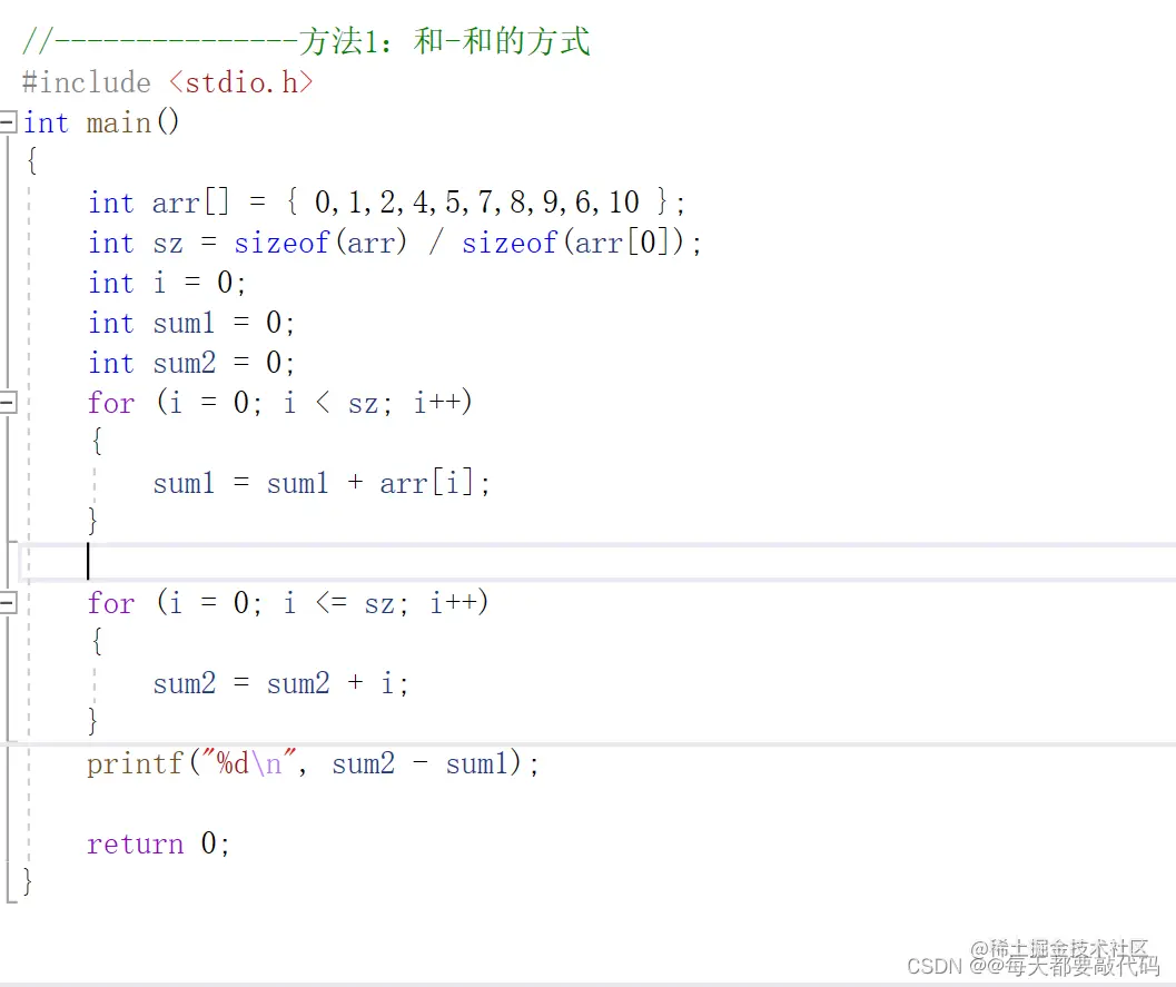 ****当你读完题目时,你可能没有读懂什么意思,也没什么思路;但是当你看完他给你的例子,我相信你的思路是不是来了呢?[3,0,1]是3个数,其实就是arr[3]={3,0,1},缺少个2;3下标从0开始就是{0,1,2,3};这样是不是有点想法?求和相减不就好了吗?