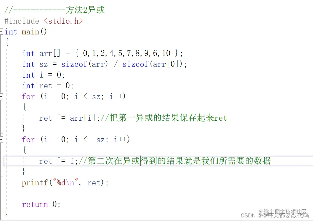 有了上面的思路,我们发散一下思维,我们和-和的形式,是不是相当于把相同的数据减掉,最终保留的是只出现一次的数据;那我们是不是就可以使用异或来求?按位异或:相同为0,相异为1;所以两个相同数异或就是0;0与任何数异或还是任何数!!!
