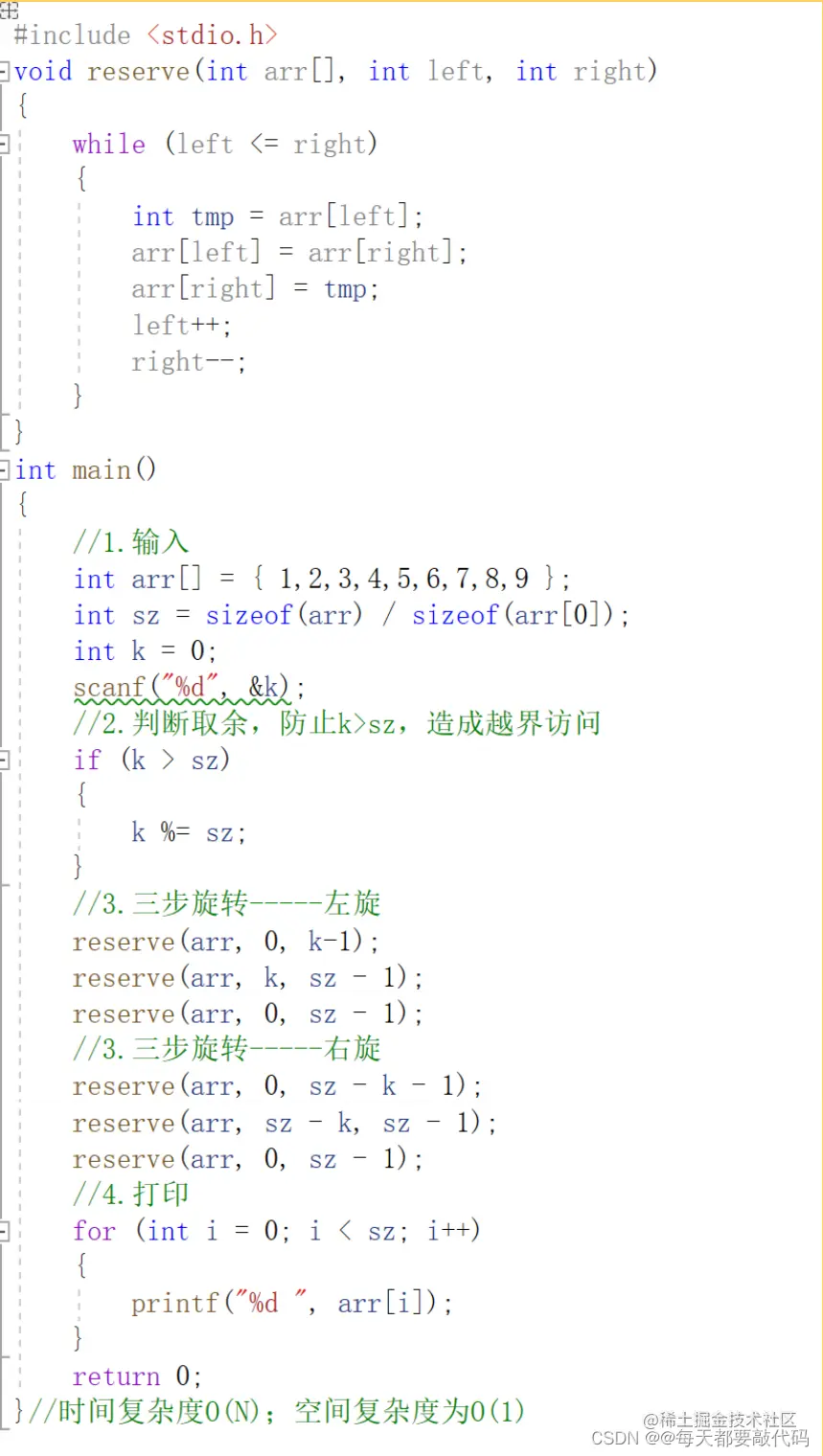 这道题目我曾遇到过类似的,旋转数组包括左转和右转,无论是哪种旋转方式,我们都要掌握;如果不理解的小伙伴可以看我的这一篇博客传送门;这篇博客里有思路的详解,这里就不在多赘述,直接上代码: