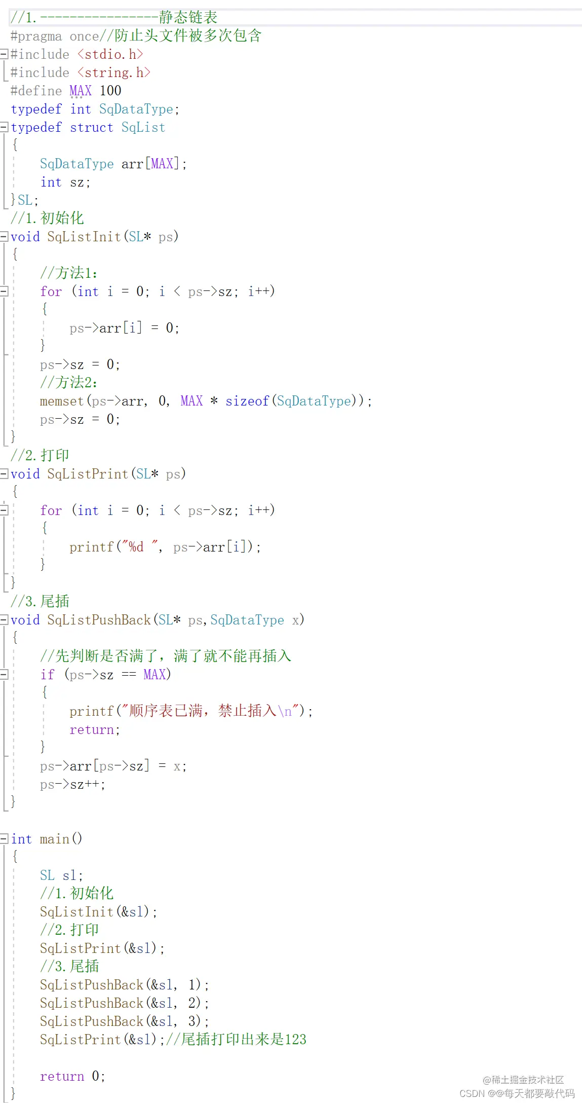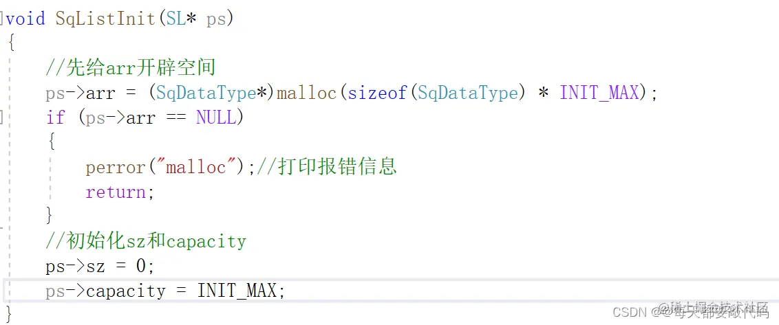 我们先对顺序表进行初始化,那么传参怎么办呢?传值还是传址?它要改变原来的数据,当然是传址啦;初始化有两种方法,自己选择一种适合自己使用就可以;