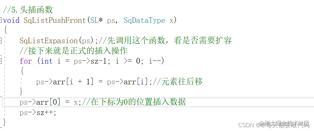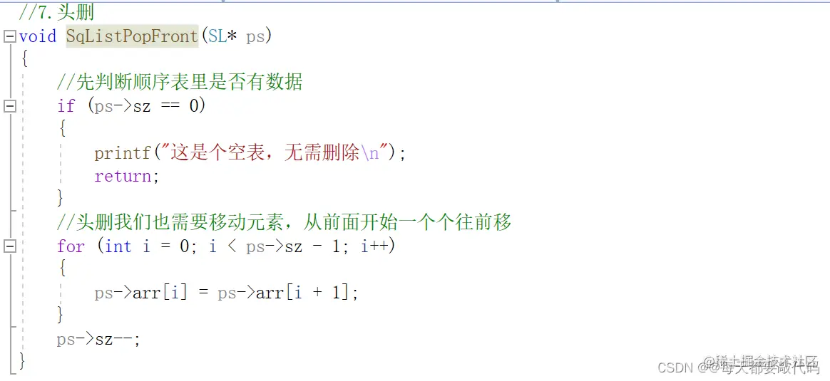 对于头删,也要先判断是否为空表;我们同样也要移动元素,从最前面开始,把数据一个个往前移;然后在把ps->sz--就可以啦:这里可以再回过头来去看一下头插函数里面的移动元素和这里头删函数移动元素的区别,对比着学习!!!
