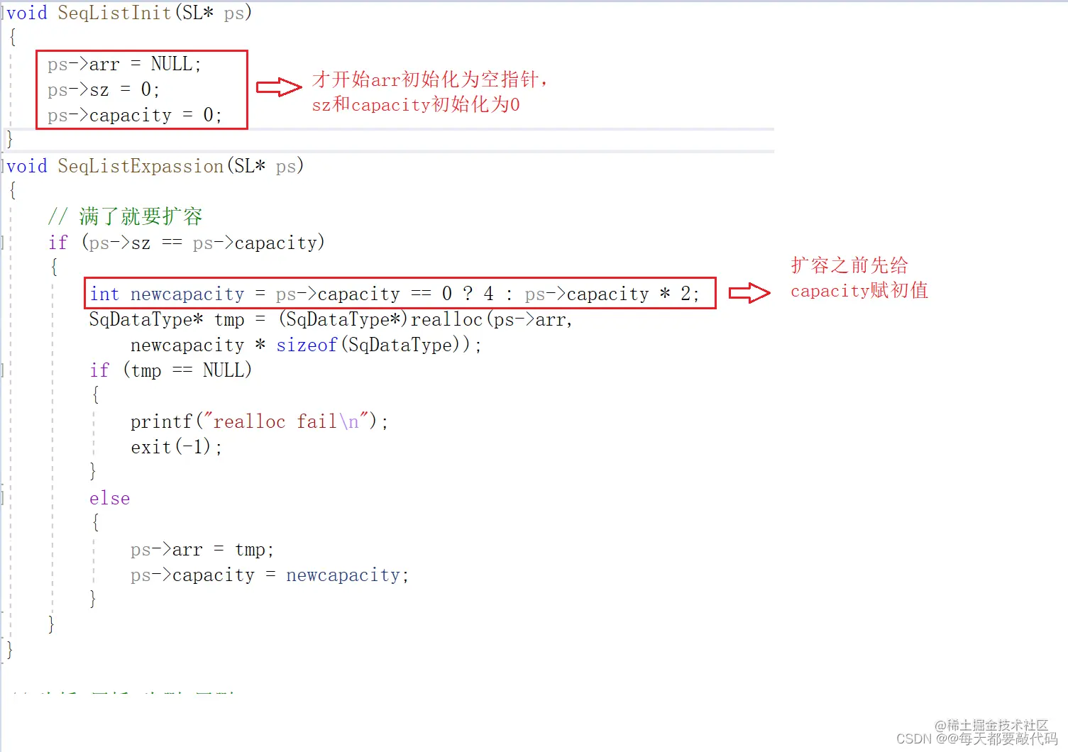 第二种初始化方式: 当然你也可以像航哥一样,才开始把ps->arr=NULL,ps->sz=0, ps->capacity = 0;我们插入的时候直接realloc进行扩容;这里就需要老铁对malloc和realloc有一定的了解了,我们思考一下,当realloc初始传一个空指针,是不是相当于malloc的作用呢?不妨自己去尝试一下吧!并且写成这种形式,我们在直接用reallo直接扩容之前,要把capacity初始化一个值,不然(倍数*capacity=0)就永远为0了;我们一般扩容为原来的两倍。